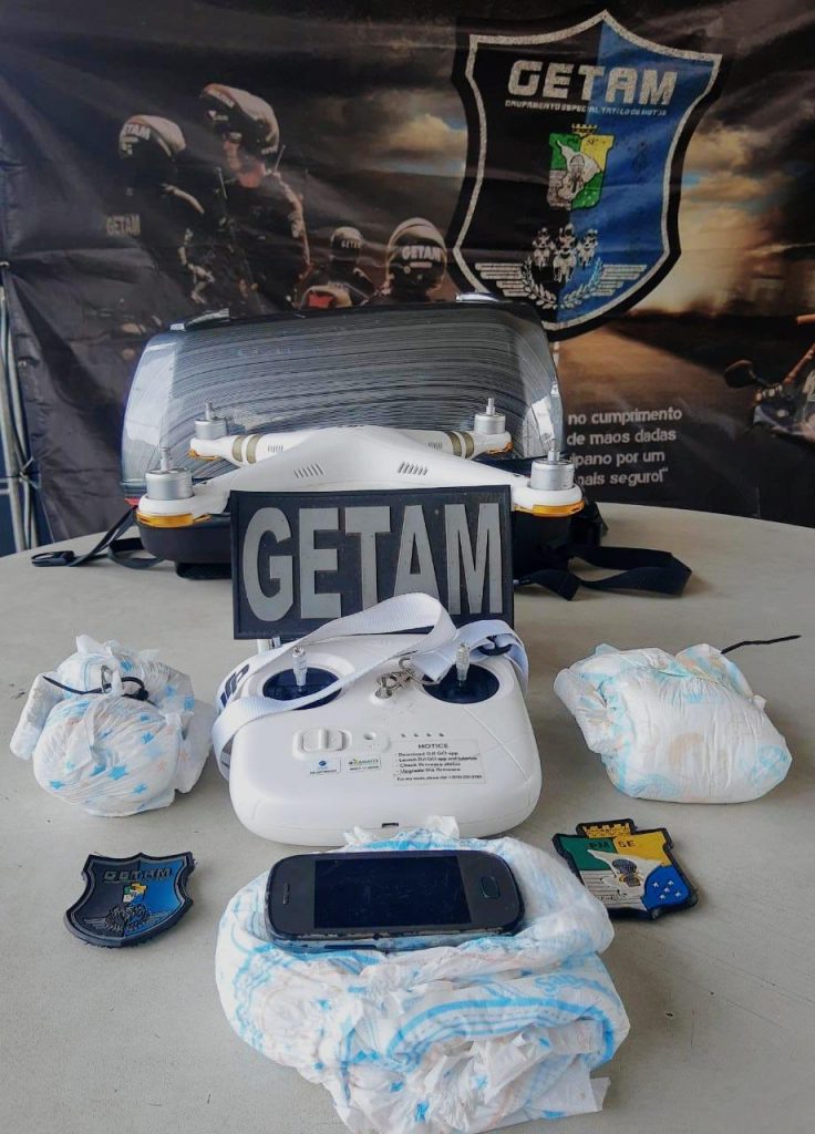De acordo com as informações policiais, militares do Getam faziam patrulhamento pela localidade quando avistaram, em um barranco, um homem em atitude suspeita, a cerca de 100 metros da unidade prisional. Os agentes verificaram que ele estava em posse de um drone, no qual estava acoplado um pacote feito com fralda descartável.