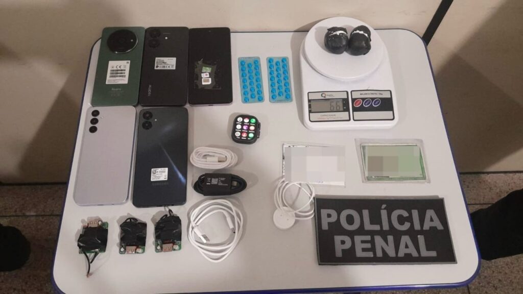 Com a jovem, foram encontrados cinco aparelhos de telefone celular, um smartwatch, quatro carregadores, dois chips de telefonia celular e duas cartelas contendo 40 comprimidos de cor azul. Além disso, foram encontrados três invólucros contendo substâncias análogas à cocaína e maconha, todos escondidos com fitas adesivas em seu corpo.