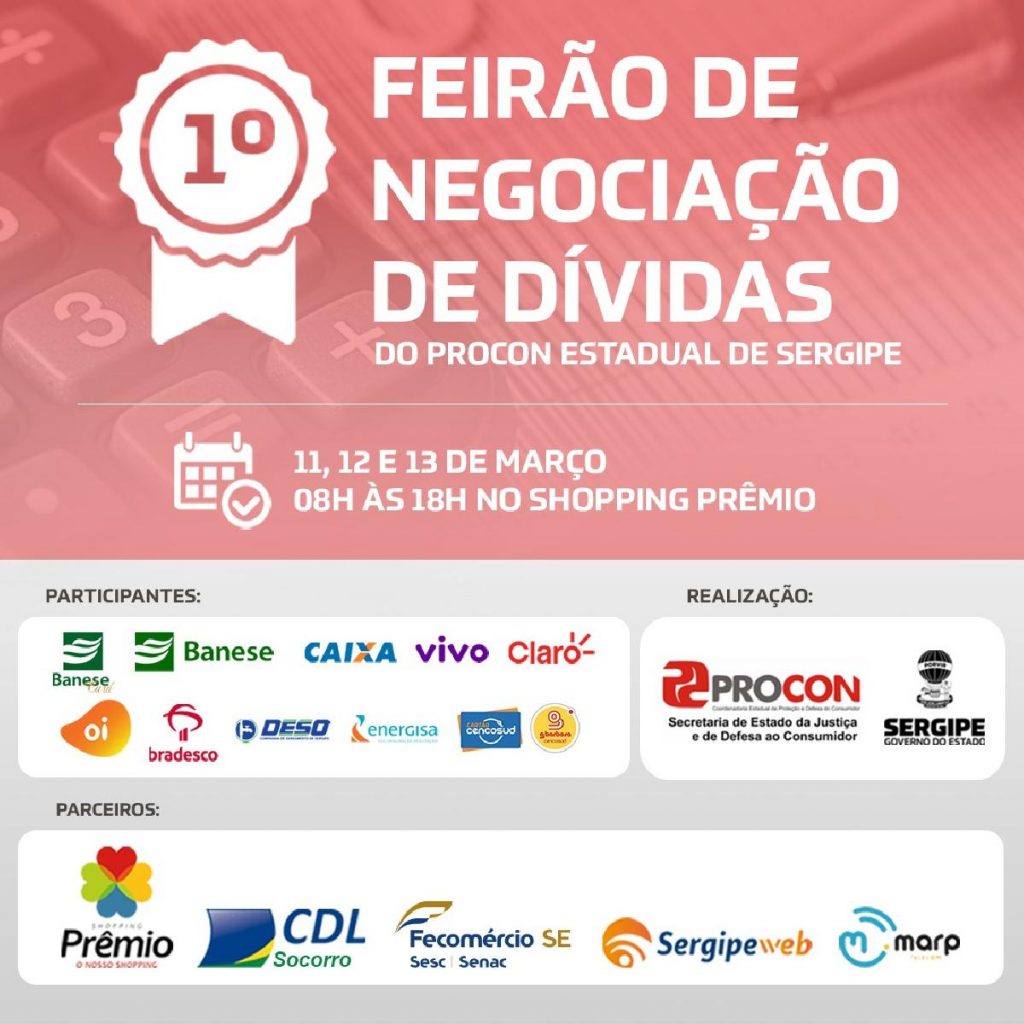 O feirão será realizado no Shopping Prêmio; Bancos, supermercado, operadoras de telefonia, além de Energisa e Deso estarão presentes Nos próximos dias 11, 12 e 13 de março, o Procon/SE realizará o I Feirão de Negociação de Dívidas do Procon Estadual Sergipe. O evento irá ocorrer no Shopping Prêmio, em Nossa Senhora do Socorro, das 8h às 18h. Diversas empresas de serviços, bancos, cartões de crédito e operadoras de telefonia estarão disponíveis para o atendimento aos consumidores. No I Feirão de Negociação de Dívidas do Procon/SE, os consumidores terão a grande oportunidade de negociar diretamente com as empresas. Estarão presentes Banese, Banese Card, Caixa Econômica Federal, Bradesco, Deso, Energisa, Cencosud (GBarbosa), Oi, Vivo e Claro. A diretora do Procon/SE, Tereza Raquel Martins, destacou a relevância do feirão. “O feirão foi pensado em razão do grande número de consumidores que procura o Procon querendo negociar dívidas. Essa será a oportunidade de negociar de forma rápida entre o consumidor e o fornecedor, recebendo todo o auxílio do Procon”, explicou. “O consumidor quer voltar ao mercado de consumo, mas para isso precisa desse auxílio do órgão para que o seu débito, já existente, seja negociado e, assim, ele consiga voltar a consumir. Na oportunidade, as empresas oferecerão taxas de juros mais baixas e formas de parcelamento que caibam no bolso do consumidor”, complementou a diretora do Procon/SE.