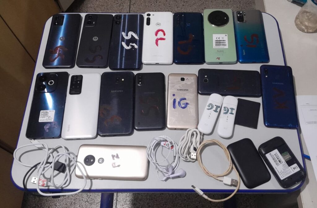 No total, foram apreendidos 15 aparelhos de telefone celular, quatro modens, quatro cabos tipo USB para carregamento de celular e um fone de ouvido.